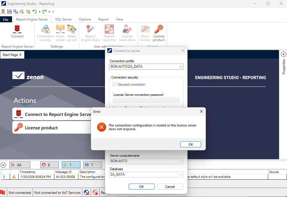 I am trying to connect to the Report Engine Server but have not been successful. The detailed error information is shown in the image below.