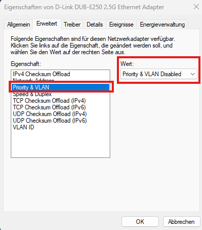 Find a setting dealing with VLAN and/or priority and make
