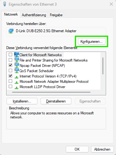 Therefore, go to the Network controller settings in Administrator mode and open the Ethernet adapter configuration by clicking on the "Configuration" button: