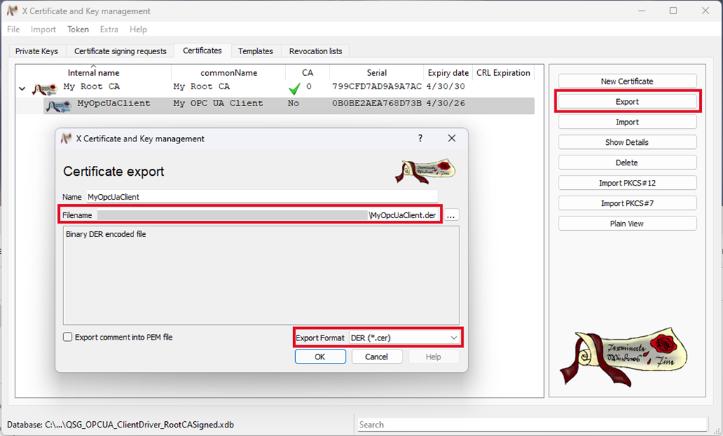 - Provide a file name for the certificate and ensure to set the file extension to .der
