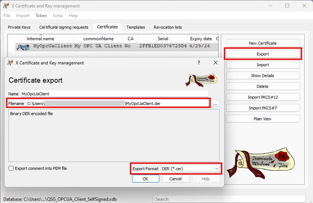 - Ensure that the export format is set to DER