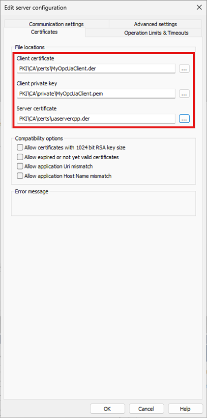- Configure the connection to the OPC UA server (without setting the certificates)
