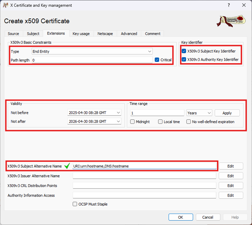 - URI:[ApplicationUri],DNS:[hostname]