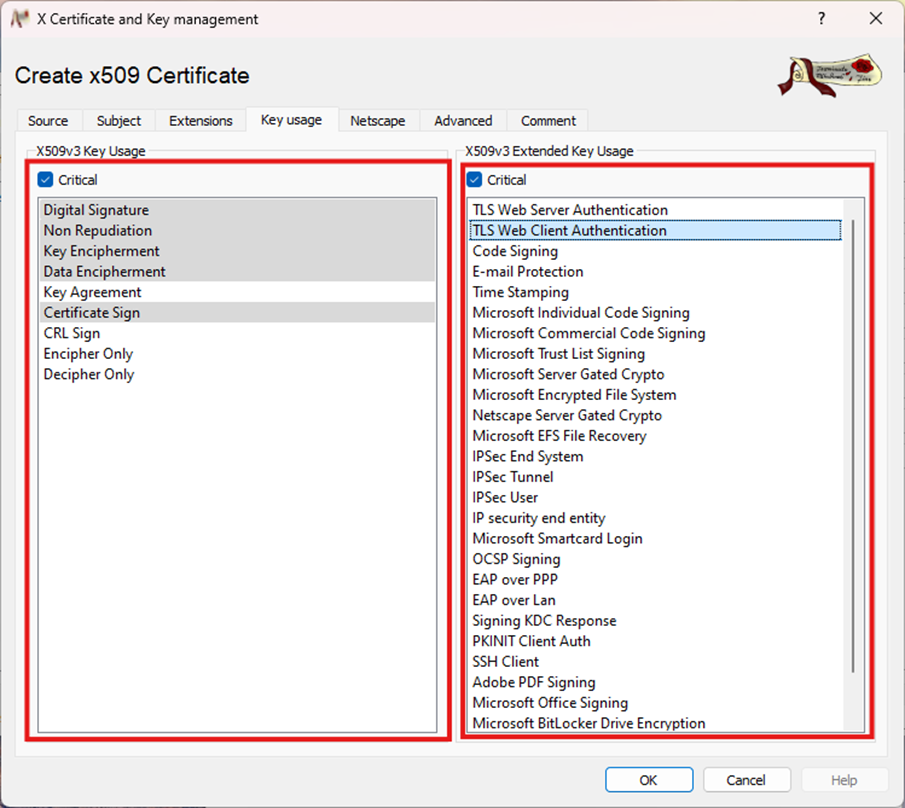 - Select Digital Signature, Non Repudiation, Key Encipherment, Data Encipherment, Certificate Sign