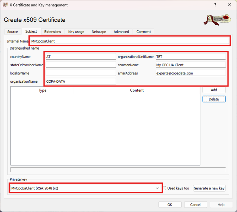 Creating a self-signed certificate using xca