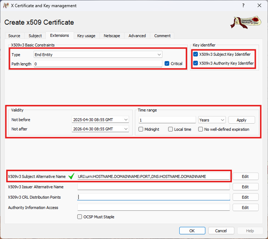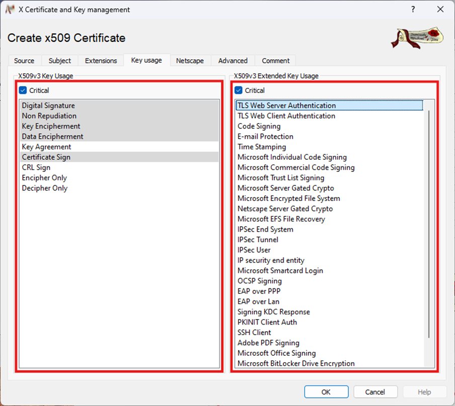 - Select Digital Signature, Non Repudiation, Key Encipherment, Data Encipherment, Certificate Sign