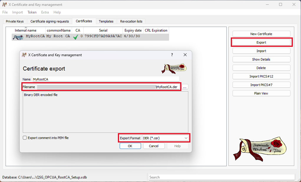 - Ensure that the export format is set to DER