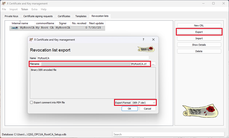 - Select the newly generated revocation list and press Export