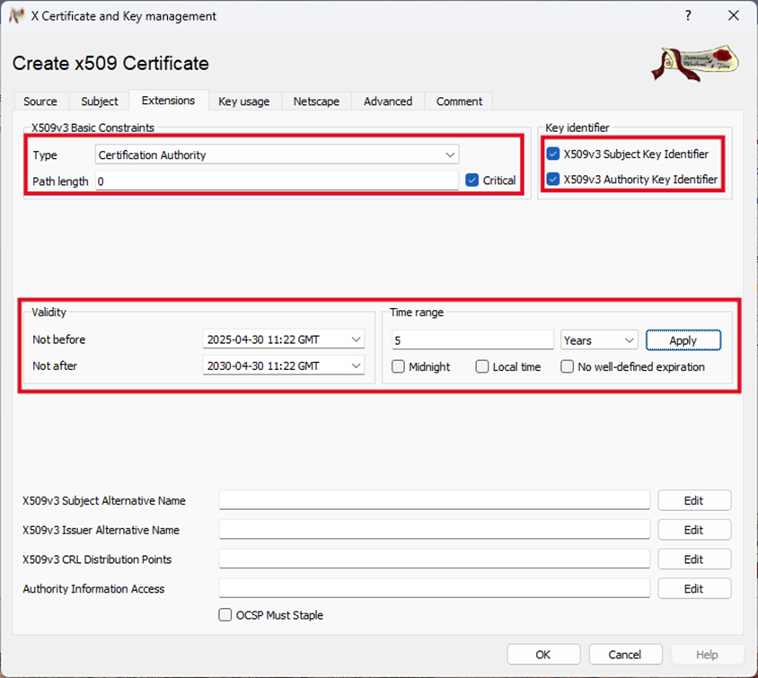 - Path length: 0 (only use a higher number, if sub-CAs shall be allowed)