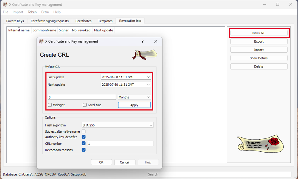 - Go to the tab Revocation lists and press New CRL